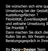 Mit einem Mausklick zu unseren Projektbeispielen Mit einem Mausklick zu unseren Referenzen Mit einem Mausklick zu unserem Impressum Sie sind hier: Deco + Design Philosophie und Leistungen